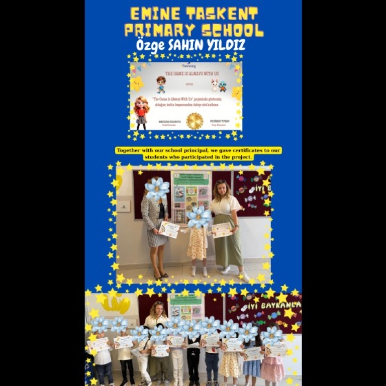 The Game Is Always With Us, "Oyun Her Zaman Bizimle " adlı e-Twinning projemizi yürüten Anasınıf Öğretmeni Özge ŞAHİN YILDIZ ve öğrencilerine projenin sonunda sertifikaları verilmiştir.